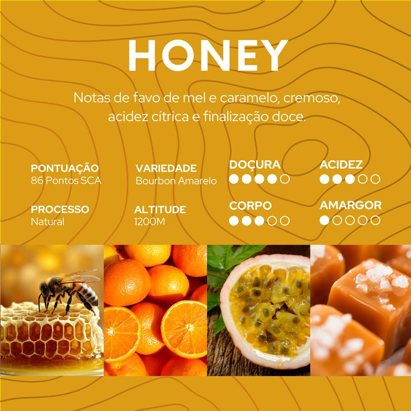 O Café Honey, traz consigo uma doçura natural do grão Bourbon amarelo. Envolvente, sensorial de favo de mel e caramelo, que lembra uma deliciosa colher do melhor mel de abelhas.
